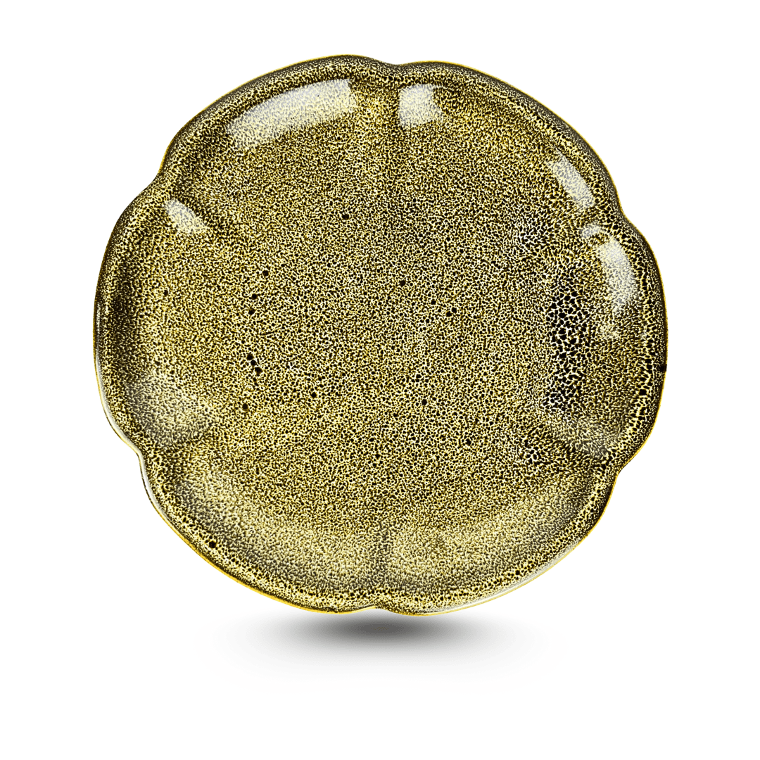Tựa một đóa kim liên (hoa sen vàng) đang mãn khai, Đĩa Viền Hoa Men Gấm Vàng là một tuyên ngôn về vẻ đẹp quyền quý và đẳng cấp. Đường viền uốn lượn mềm mại như những cánh sen, kết hợp cùng những đường vân men vàng óng ả lan tỏa, biến mỗi món ăn trở thành một yến tiệc hoàng gia thu nhỏ.